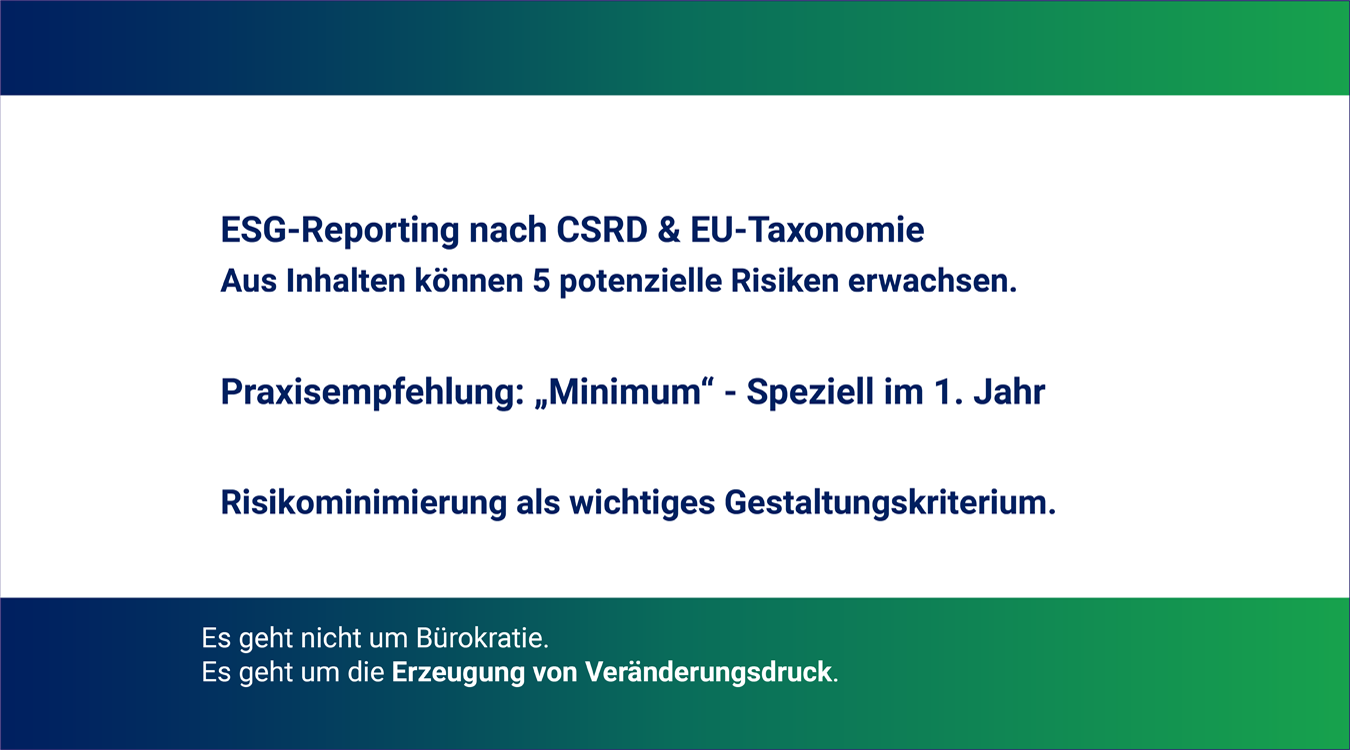 Der 1. CSRD-Bericht: Es geht nicht um Bürokratie. Es geht um die Erzeugung von Veränderungsdruck. Ziel ist die detaillierte Information der Stakeholder, um diesen Angriffspunkte für Reaktion, für Druck zu bieten, speziell NGOs & Öffentlichkeit. So entstehen Risiken für Reputation, Umsatz. Mit der Zahl der Informationen steigt die Zahl der Angriffspunkte. Risikominimierung sollte wesentliches Gestaltungskriterium des 1. CSRD-Berichts sein.