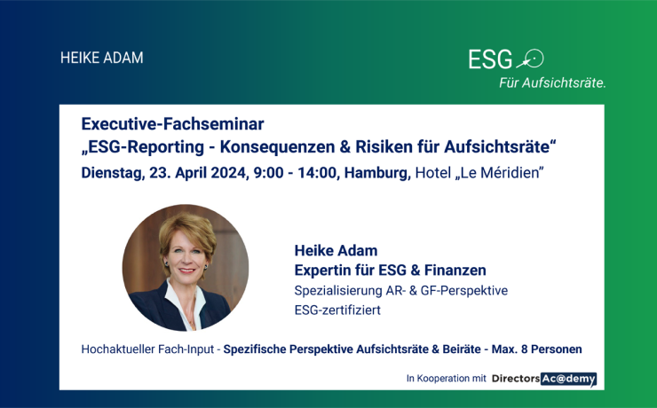 Die massive Herausforderung ESG, auch für die Sorgfaltspflicht der Aufsichtsräte – ESG-Praxis-Expertin Heike Adam schafft Klarheit.